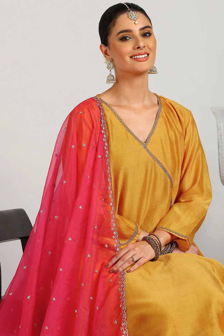 Our Fusia Pink Organza dupatta is adorned with all-over delicate sequins work & scalloped edges.