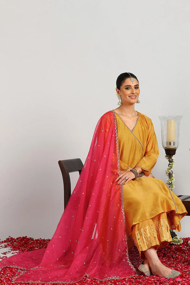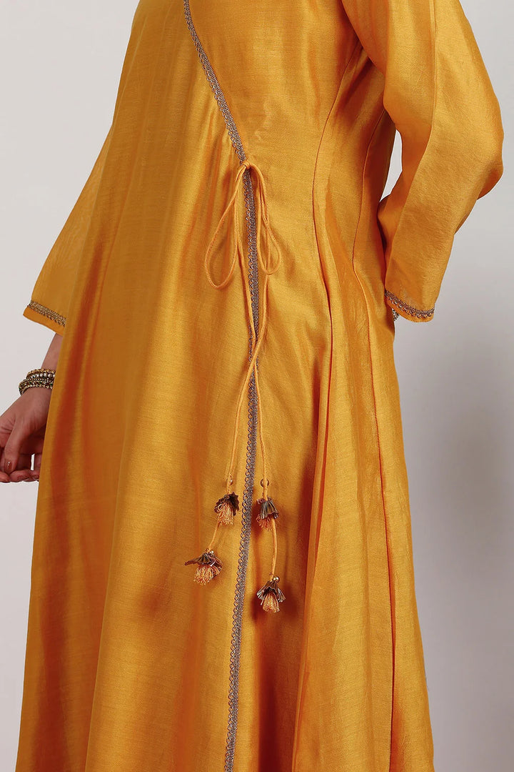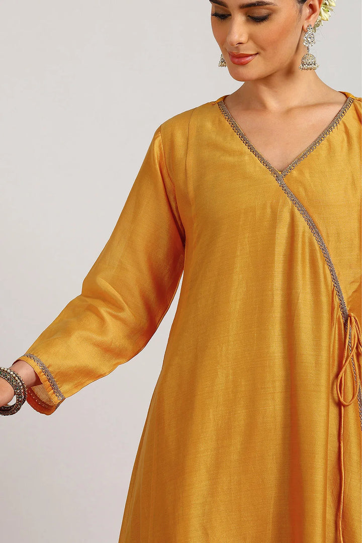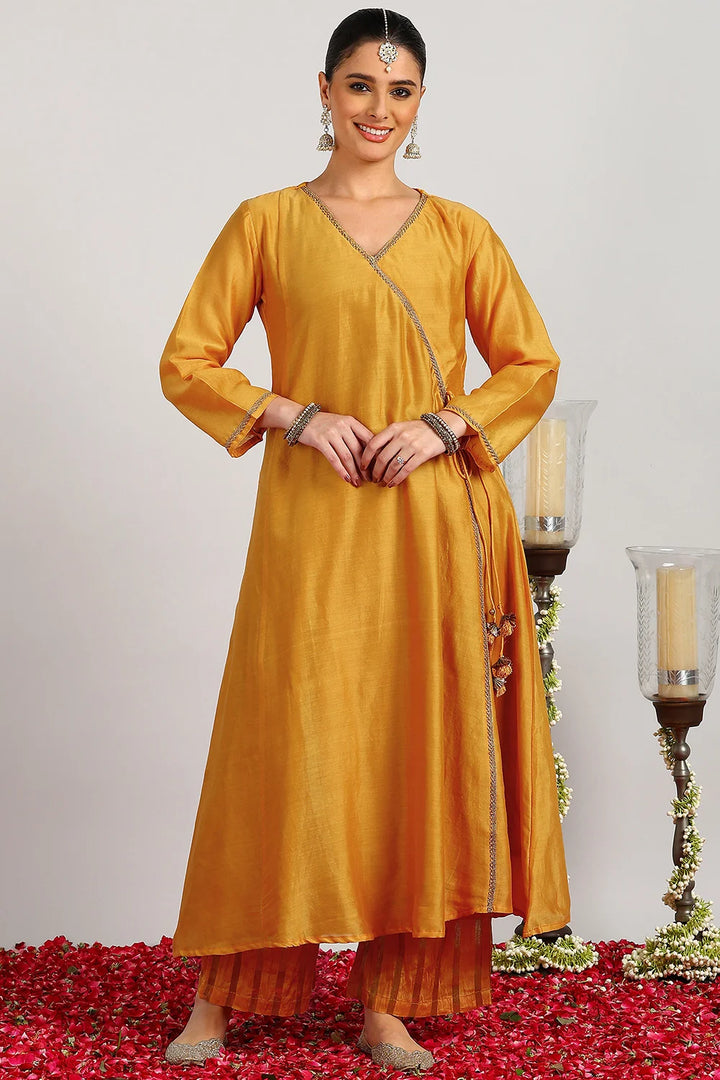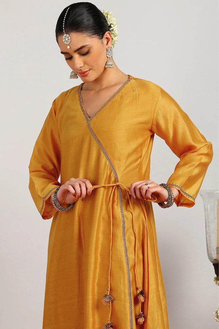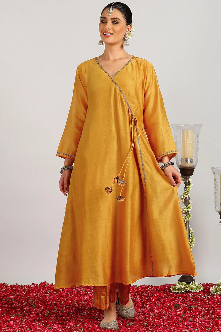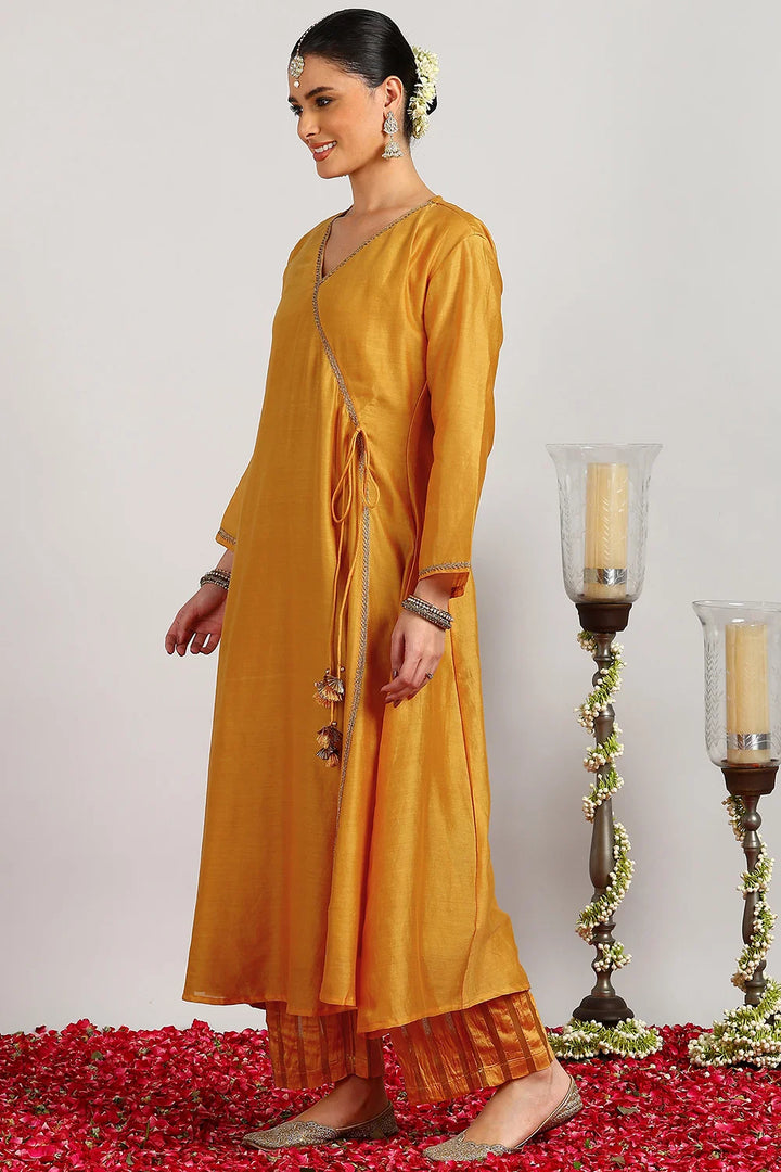 Crafted from our signature lightweight Chanderi Silk Fabric, our yellow Angrakha Kurta is hand-finished with intricate Gota zari borders on its neckline and sleeves. Pair this kurta with our super soft Chanderi & Tissue silk Pants and be ready for any occassion.