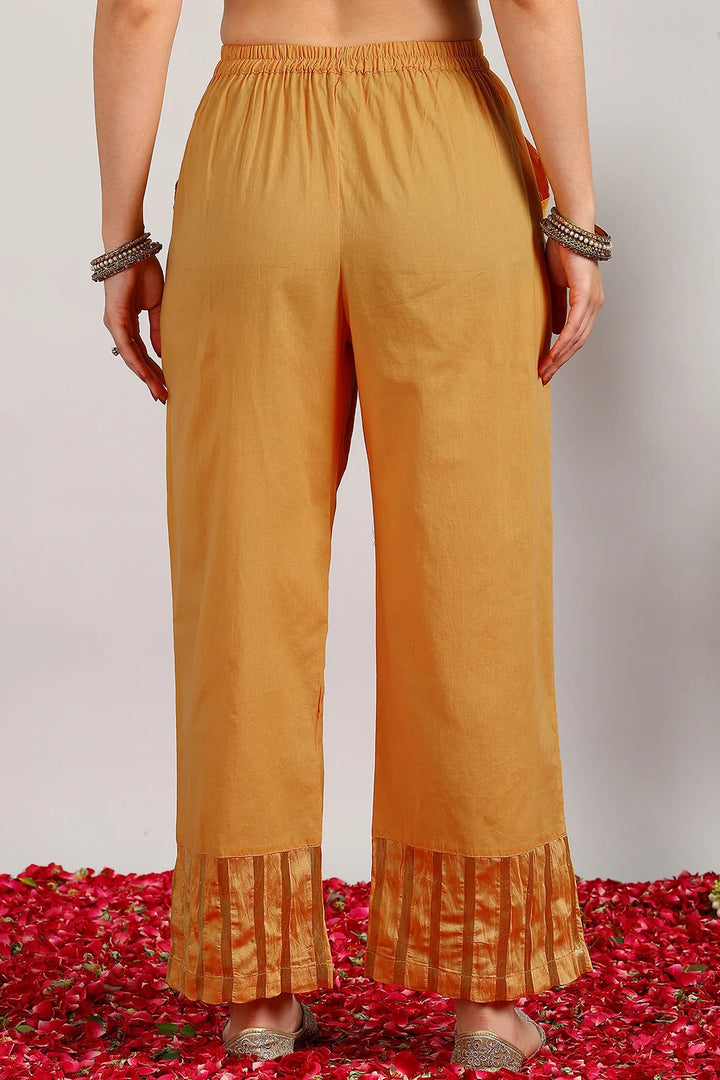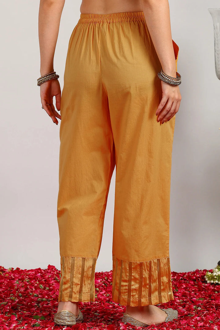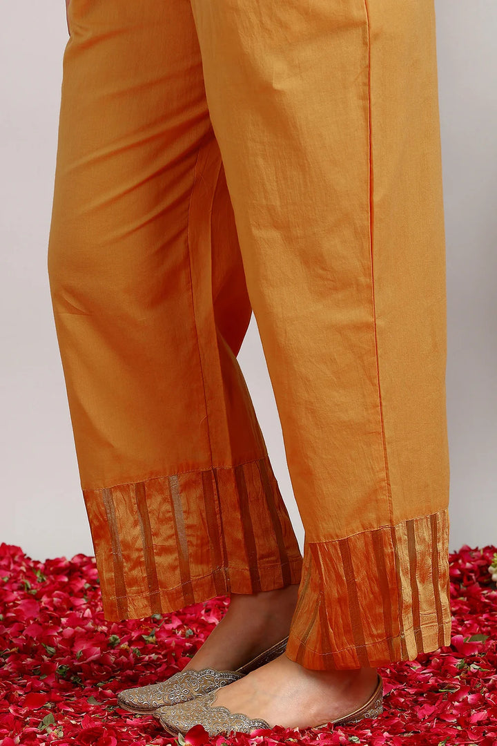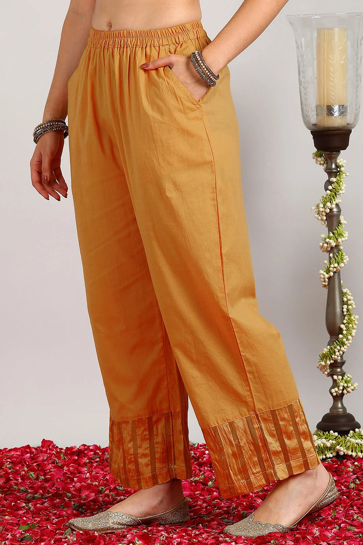 Farsi pants in soft Chanderi Silk, tailored in a relaxed fit, with deep-seated pockets for that extra comfort. The yellow tone makes them a versatile base to pair with festive kurtas or everyday tunics. Its striped Tissue endings gives it a festive feel altogether.