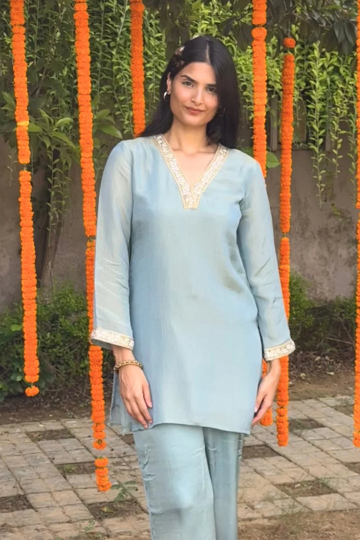Crafted from our signature lightweight Crinkled Tissue Fabric, our Co-Ord set comes with an asymmetrical Kurtee in tissue and feather soft Pallazoes in Modal silk. This set is hand-finished with intricate embroidered borders of zari and pearl,by our skilled seamstresses in our atelier.