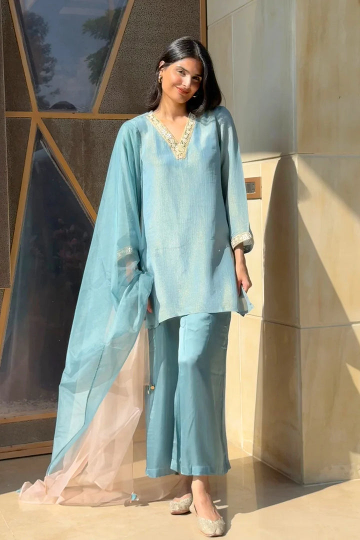 Blue Crinkle Tissue Silk Kurtee (Set of 2)