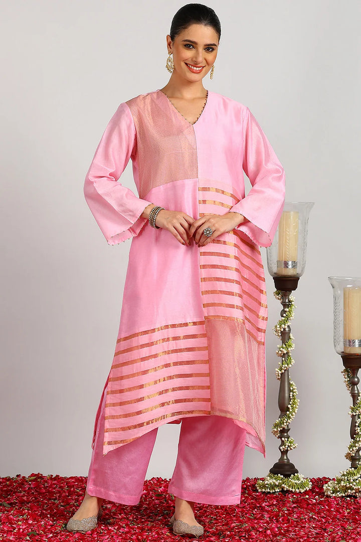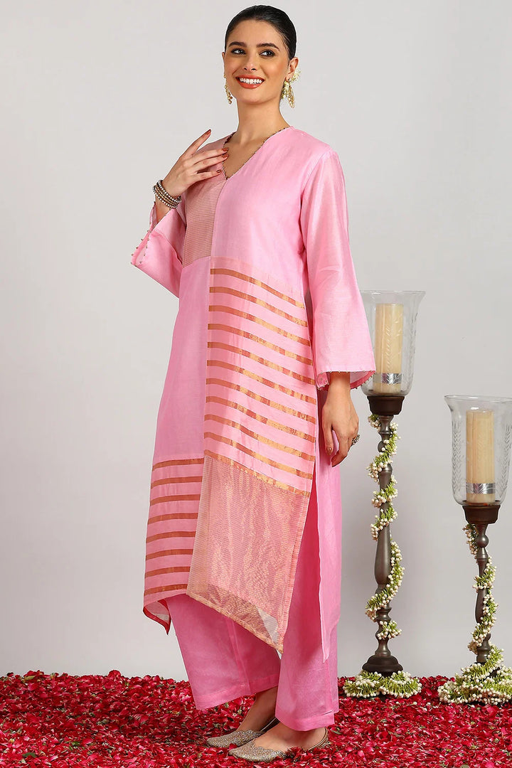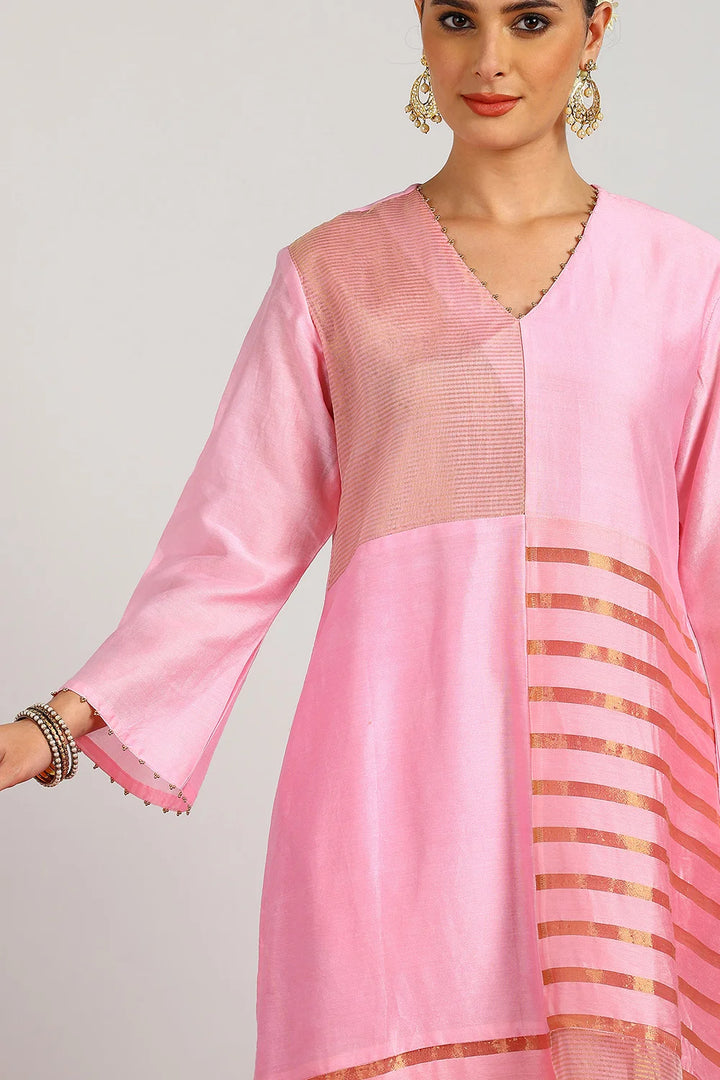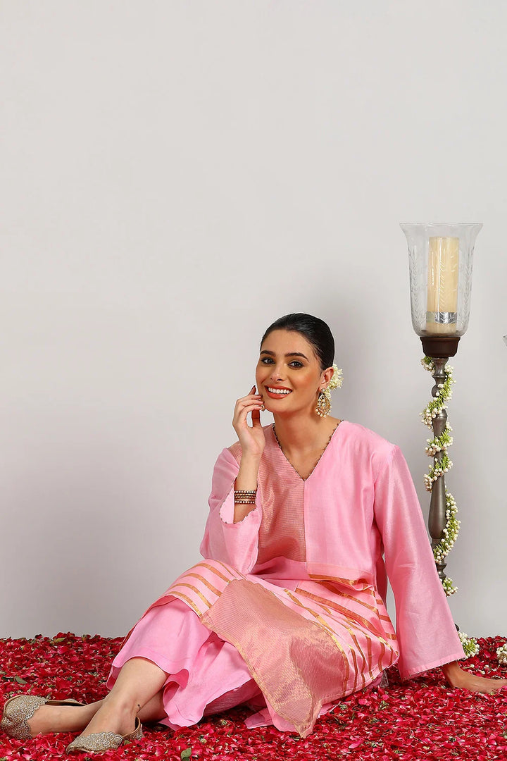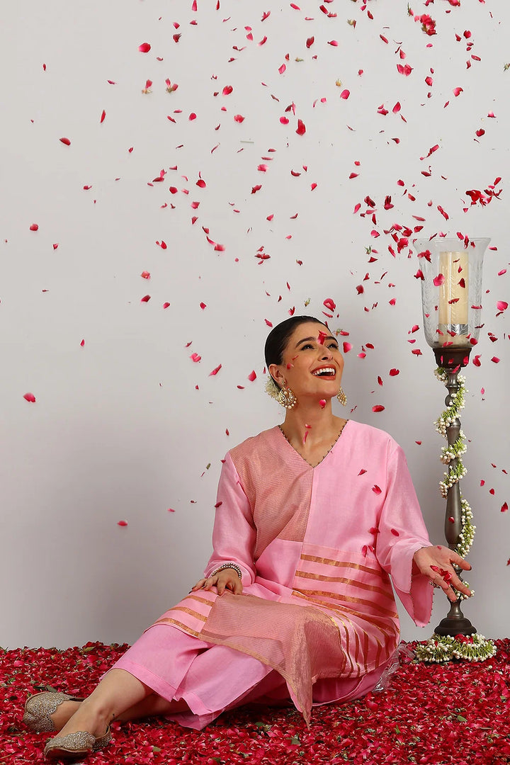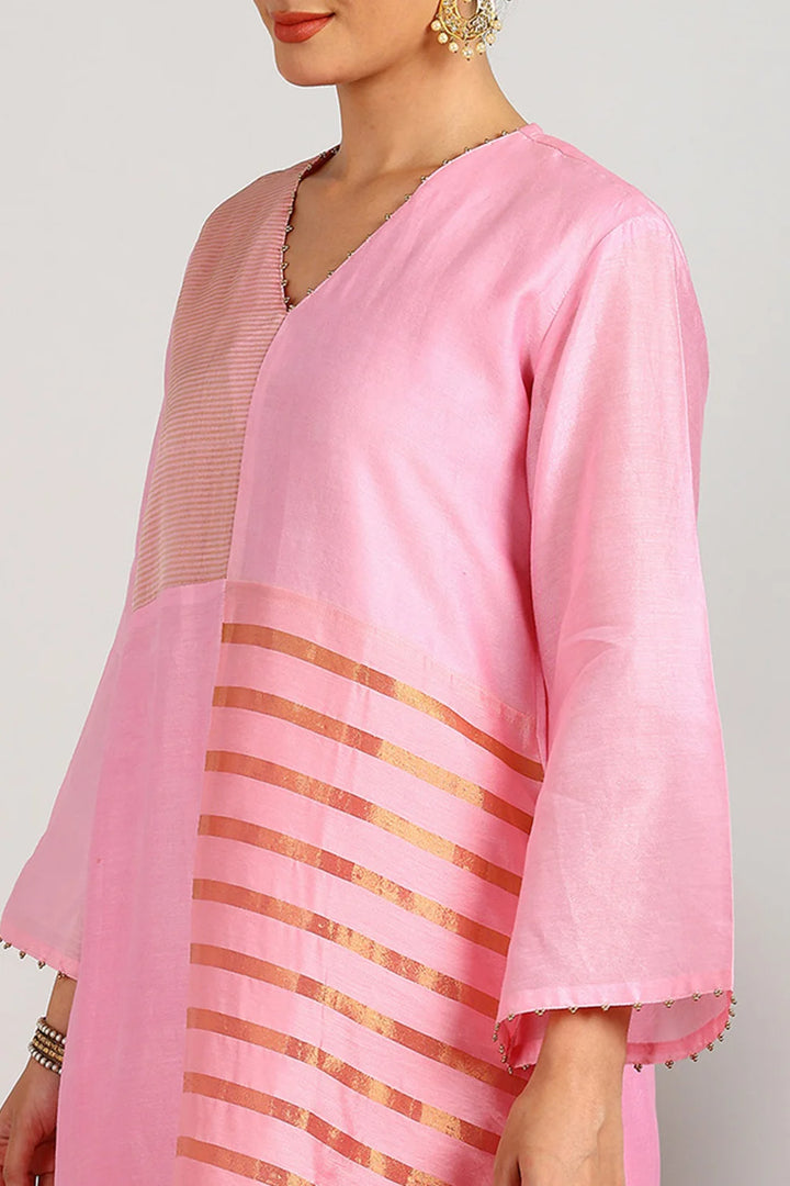 Crafted from our signature blend of lightweight Chanderi Silk and Tissue Silk, this elegant pink kurta set is designed for timeless sophistication. The A-line kurta is beautifully detailed with hand-finished striped tissue fabric in an abstract pattern, adding subtle texture and charm. Paired with soft, flowy Chanderi Silk Farsi Pants, this set ensures both comfort and grace. Perfect for festive gatherings, celebrations, or special occasions, it’s a versatile addition to your ethnic wardrobe. Â